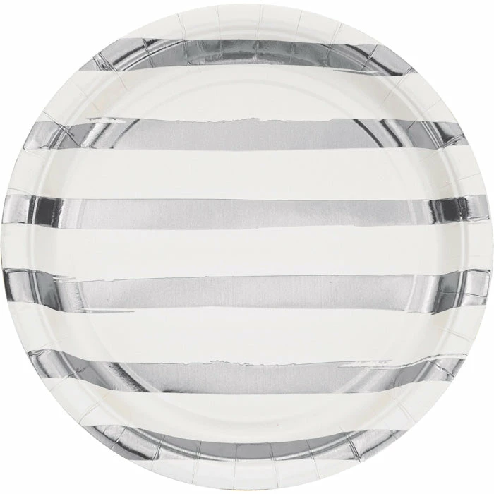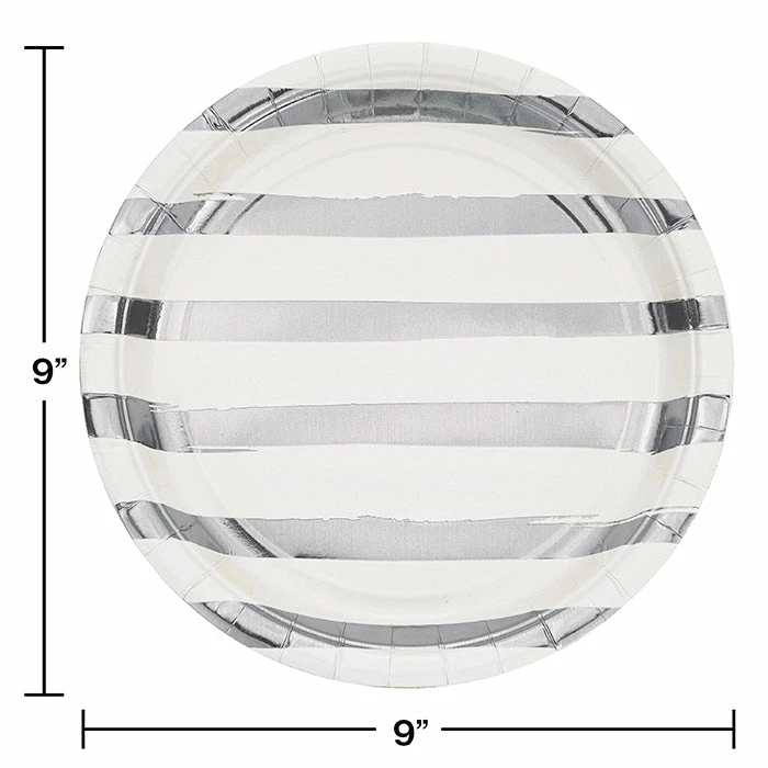 Details: Make your dining experience sublime with the addition of the White and Silver Foil Striped Paper Plates. Beautifully designed, these dinner plates are a perfect contribution to make sure your party atmosphere is pristine. The foil plates measure 9″. With discount pricing, our White and Silver Foil Striped Dinner Plates are perfect for event planners, caterers, and home hostesses alike. For this price, you get one package containing (8) White And Silver Foil Striped Paper Plates. Approximate Dimensions: 8.75 in x 8.75 in