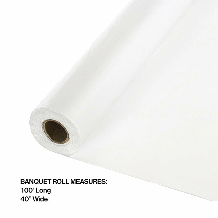 Details: Protect your table and make clean-up a breeze with the White Banquet Roll. This plastic table roll measures 40″ x 100′ and is great for large gatherings and covering long tables. This product can be mixed and matched with other White party supplies. With discount pricing, our White Banquet Roll are perfect for event planners, caterers, and home hostesses alike. You get one White Banquet Roll 40″ X 100′ for this price. Approximate Dimensions: 100 ft x 40 in