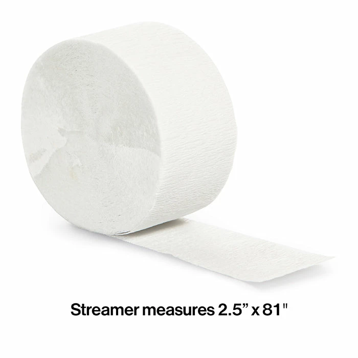 Details: Streamers are an inexpensive and simple way to provide a festive accent to the decoration at bridal showers, baby showers, birthday celebrations, and more. The 81 foot length of crepe paper streamer can be used to create eye catching displays on tables, over windows, around doorways, and along banisters. All that is required is scotch tape and creativity. An added bonus is that streamers can simply be disposed of at the end of the festivities. White Streamers are sold at a discount price. You get one White Crepe Streamers 81′ for this price. Approximate Dimensions: 81 ft x 1.75 in