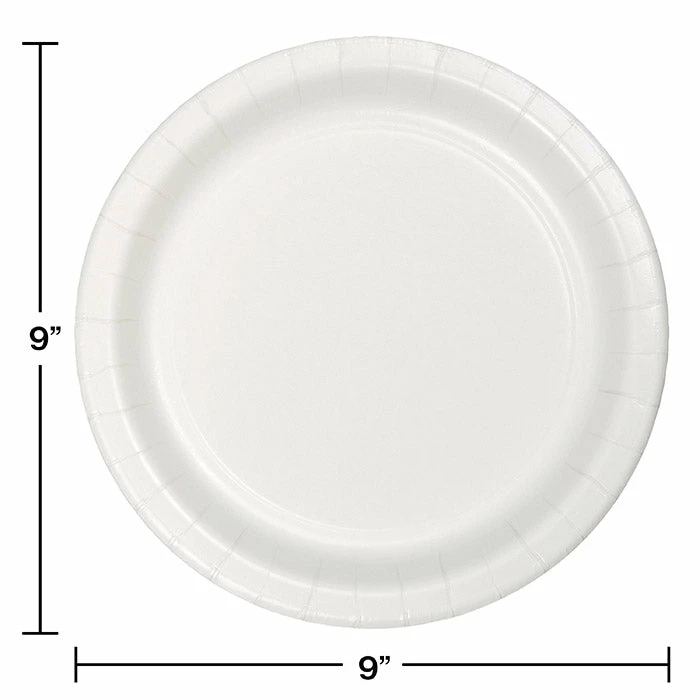 Details: White 8.75 Inch Dinner Plates add a crisp and clean appearance to the party decoration at wedding receptions, birthday celebrations, baby showers and more. Event planners, caterers, and budget friendly hostesses will love the ease of use. Constructed of heavyweight paper board stock the dinner plates can be simply disposed of or recycled at the end of the festivities. Perfect for larger celebrations, they are easy to transport, set-up, and dispose of. The White Dinner Plates include 24 plates per package. For this price, you get one package containing (24) White Dinner Plates. Approximate Dimensions: 8.75 in x 8.75 in